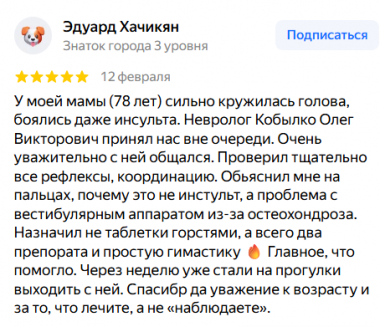 У моей мамы (78 лет) сильно кружилась голова, боялись даже инсульта. Невролог Кобылко Олег Викторович принял нас вне очереди. Очень уважительно с ней общался. Проверил тщательно все рефлексы, координацию. Обьяснил мне на пальцах, почему это не инстульт, а проблема с вестибулярным аппаратом из-за остеохондроза. Назначил не таблетки горстями, а всего два препората и простую гимастику 🔥 Главное, что помогло. Через неделю уже стали на прогулки выходить с ней. Спасибр да уважение к возрасту и за то, что лечите, а не «наблюдаете».