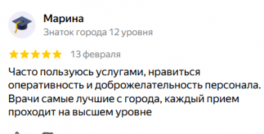Часто пользуюсь услугами, нравиться оперативность и доброжелательность персонала. Врачи самые лучшие с города, каждый прием проходит на высшем уровне