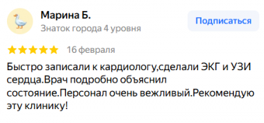 Быстро записали к кардиологу,сделали ЭКГ и УЗИ сердца.Врач подробно объяснил состояние.Персонал очень вежливый.Рекомендую эту клинику!