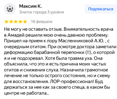 Не могу не оставить отзыв. Внимательность врача в Амадей решили мою очень давнюю проблему. Пришел на прием к лору Масленниковой А.Ю. , с очередным отитом. При осмотре доктора заметили деформацию барабанной перепонки (!!), о которой я и не подозревал. Хотя была травма уха. Она объяснила, что это и есть причина моих частых отитов и снижения слуха. Назначила грамотное лечение не только острого состояния, но и схему для восстановления. ЛОР-профессионал! Буд держаться за нее как за своего спеца, в каком бы центре не работала..
