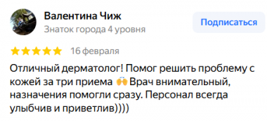 Отличный дерматолог! Помог решить проблему с кожей за три приема 🙌Врач внимательный, назначения помогли сразу. Персонал всегда улыбчив и приветлив))))