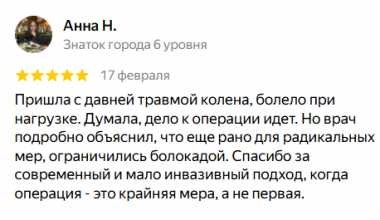 Пришла с давней травмой колена, болело при нагрузке. Думала, дело к операции идет. Но врач подробно объяснил, что еще рано для радикальных мер, ограничились болокадой. Спасибо за современный и мало инвазивный подход, когда операция — это крайняя мера, а не первая.