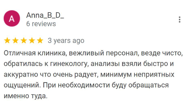Отличная клиника, вежливый персонал, везде чисто, обратилась к гинекологу, анализы взяли быстро и аккуратно что очень радует, минимум неприятных ощущений. При необходимости буду обращаться именно туда.