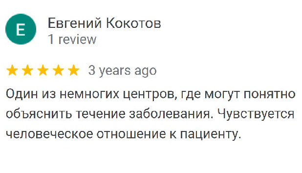 Один из немногих центров, где могут понятно объяснить течение заболевания. Чувствуется человеческое отношение к пациенту.