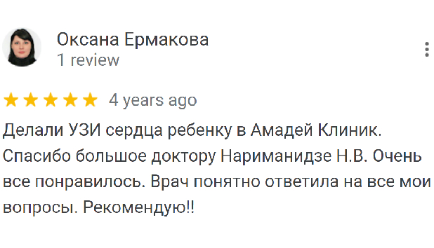 Делали УЗИ сердца ребенку в Амадей Клиник. Спасибо большое доктору Нариманидзе Н.В. Очень все понравилось. Врач понятно ответила на все мои вопросы. Рекомендую!!