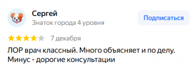 ЛОР врач классный. Много объясняет и по делу. Минус — дорогие консультации