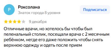 Отличные врачи, но хотелось бы чтобы был пеленальный столик, посещали врача с 2 месячным ребёнком, негде его даже положить чтобы снять верхнюю одежду и одеть после прием