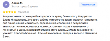 Хочу выразить огромную благодарность врачу Гинекологу Кондратюк Елене Николаевне. Это врач, работа которого не заканчивается на приеме, она лично нашла мой номер, перезвонила, сообщила о результатах анализов, поинтересовалась моим состоянием после назначенного лечения. Я в шоке, в хорошем смысле этого слова. Думала таких врачей уже нет! Спасибо большое . Елена Николаевна, теперь я только с Вами и за Вами