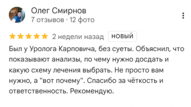 Был у Уролога Карповича, без суеты. Объяснил, что показывают анализы, по чему нужно досдать и какую схему лечения выбрать. Не просто вам нужно, а «вот почему». Спасибо за чёткость и ответственность. Рекомендую.