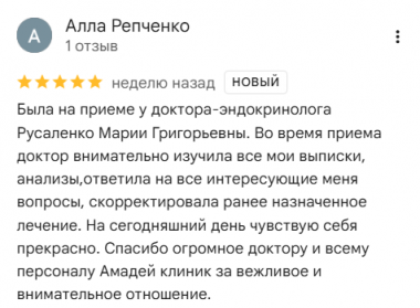 Была на приеме у доктора-эндокринолога Русаленко Марии Григорьевны. Во время приема доктор внимательно изучила все мои выписки, анализы,ответила на все интересующие меня вопросы, скорректировала ранее назначенное лечение. На сегодняшний день чувствую себя прекрасно. Спасибо огромное доктору и всему персоналу Амадей клиник за вежливое и внимательное отношение.