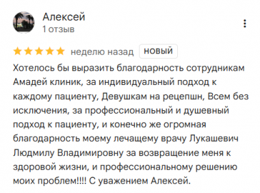 Хотелось бы выразить благодарность сотрудникам Амадей клиник, за индивидуальный подход к каждому пациенту, Девушкам на рецепшн, Всем без исключения, за профессиональный и душевный подход к пациенту, и конечно же огромная благодарность моему лечащему врачу Лукашевич Людмилу Владимировну за возвращение меня к здоровой жизни, и профессиональному решению моих проблем!!!! С уважением Алексей.
